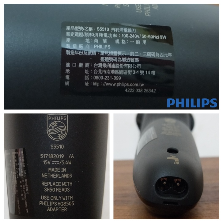 ▲S5510電鬍刀背面有產品基本資料,產地是「荷蘭」耶。機身下方設計8字頭充電孔,機身上面水龍頭的符號表示可以水洗。