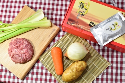『減肥蔬菜湯』準備食材 : 紅蘿蔔1支、芹菜1小把、馬鈴薯1顆、絞肉約150g、洋蔥1顆、滴雞精1包