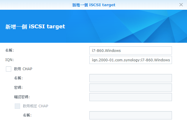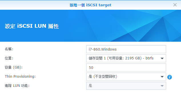 1. 首先,我們按之前的方法,在 Synology NAS 上建立一個新的 iSCSI 磁碟,目標名稱為「您的機器名稱.Windows」,過程中的畫面如下圖所示。