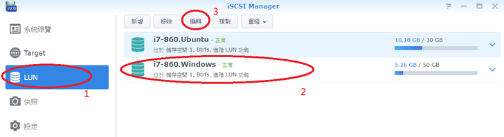 要調整 iSCSI 磁碟大小,我們先打開 Synology iSCSI Manager 介面的 LUN 部分。選取目標 iSCSI 的 LUN 後按編輯,再輸入新的容量即可。