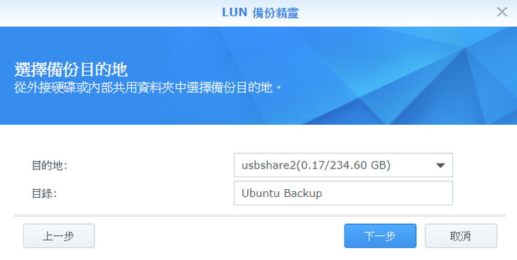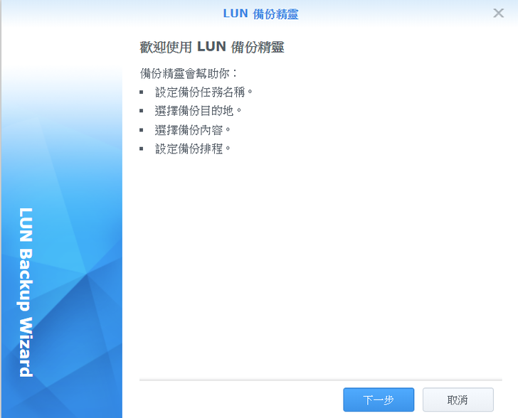 完成格式化後,找到 Hyper Backup 套件並將其開啟。在沒有已排程的備份下,Hyper Backup 會先開啟備份精靈進行檔案備份。由於我們今次是要備份 iSCSI 磁碟,所以直接按「取消」關閉此畫面即可。