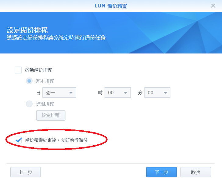 這些我們只需要備份一次,所以選「立即執行備份」就好。