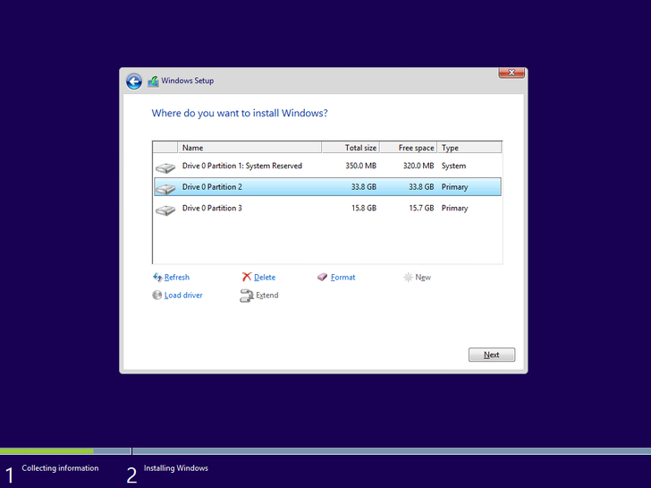 接著的過程就和一般安裝 Windows 一模一樣了。選擇磁碟機時,也沒有發現什麼異樣。照常地分割、格式化就可以了。