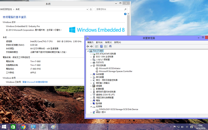 7. 重新啟動,我們終於看到桌面了(感動中)!並且終於不用VMware 也能截圖了!再看看系統管理員,果然只有一個 iSCSI 磁碟啊哈哈 (狂笑中)……Windows還能成功啟用!(裝的不是英文版嗎?裝了語言包就有中文啦!)