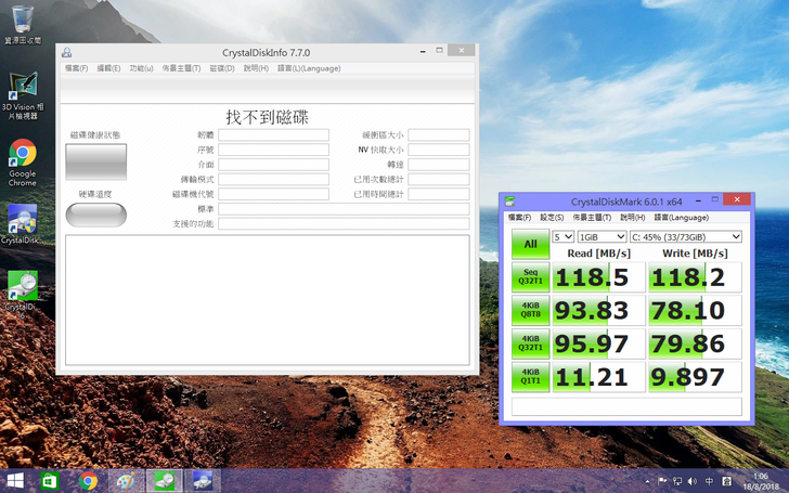 CrystalDiskInfo 說它找不到磁碟 (也難怪,它只會搜尋那些「正常」的磁碟機介面,如 IDE、SATA 等),而 CrystalDiskMark 到成績倒比想像中好 (4K 的速度好像蠻快的……)。這個測試成績是以較快的 DS918+ 及 RAID5 達成的。