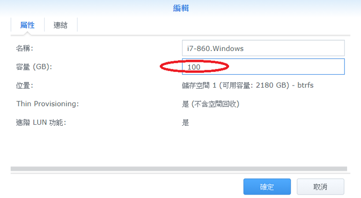 - 如果只是當初指派給 iSCSI 的空間用完了,但事實上 NAS 還有空間的話,我們可以直接增加 iSCSI 磁碟的容量,再把電腦重開機就可以了。當然,磁碟分割還是保持原本的大小,需要用磁碟管理等工具來調整磁碟分割大小