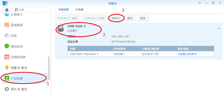 事不宜遲,我們馬上來看看它的操作方法,首先,準備一台 USB 外置硬碟並將其接上 Synology NAS。我們需要將其格式化為 ext4 檔案系統,才可以在 Hyper Backup 內使用。前往控制台的「外接裝置」,選擇自己的 USB 裝置後,按「格式化」。