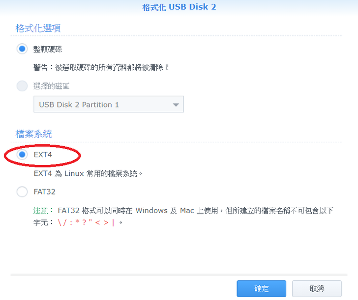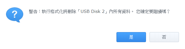 檔案系統選擇 ext4,Synology NAS 會提醒各位記得要檢查 USB 裡面有沒有重要的資料,因為格式化之後,裡面的資料就全部消失了哦……