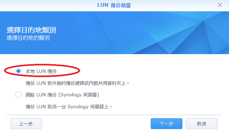 由於我們是要將 iSCSI 磁碟備至 USB 磁碟,所以這裡選「本地 LUN 備份」。