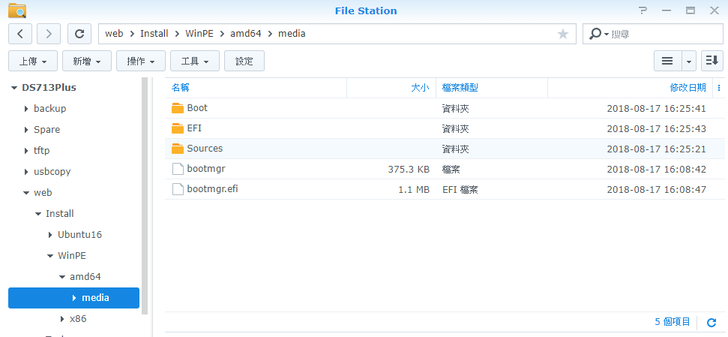 2. 準備好 Windows PE 的 ISO 後,在 web 共享資料夾內的 Install 資料夾 (上次裝 Ubuntu 時弄出來的,記得嗎?) 裡新增WinPE\amd64\media 及 WinPE\x86\media 兩個目錄,再把完成的 Windows PE 中的所有東西複製到上述其中一個目錄。32 位元就複製到 x86\media 裡,64 位元就複製到 amd64\media 裡。我們現在假設要安裝的是 64 位元 Windows,複製完後看上去就像這樣。