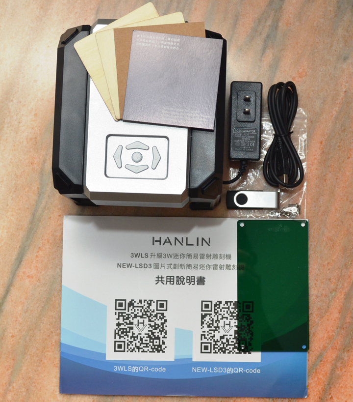 ▲ 配件有USB 使用說明/驅動軟體隨身碟、螺絲、護目防護板、電源供應器、傳輸線等,還附贈雕刻材料來試刻,以及對焦黑卡。