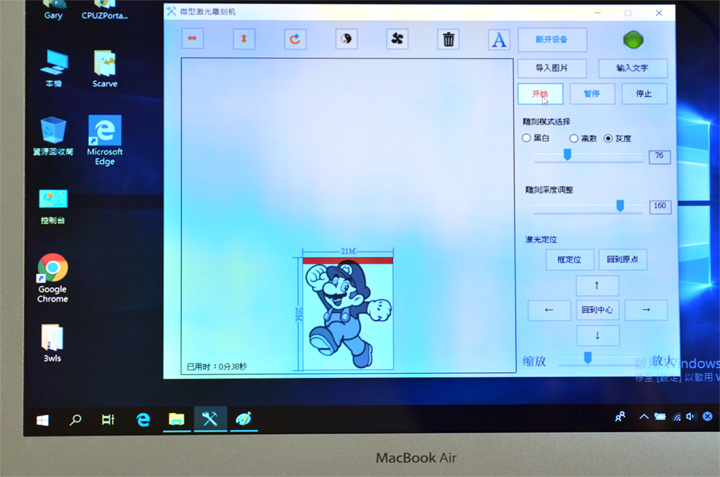 ▲ 3WLS 的應用程式比舊版 LSD3 操作更簡單,除了不需調激光強度,只需調整深度;再來連線下,當我們放大、縮小、移動時,雷射頭也會同步作動,讓我們可立刻知道雕刻的位置。