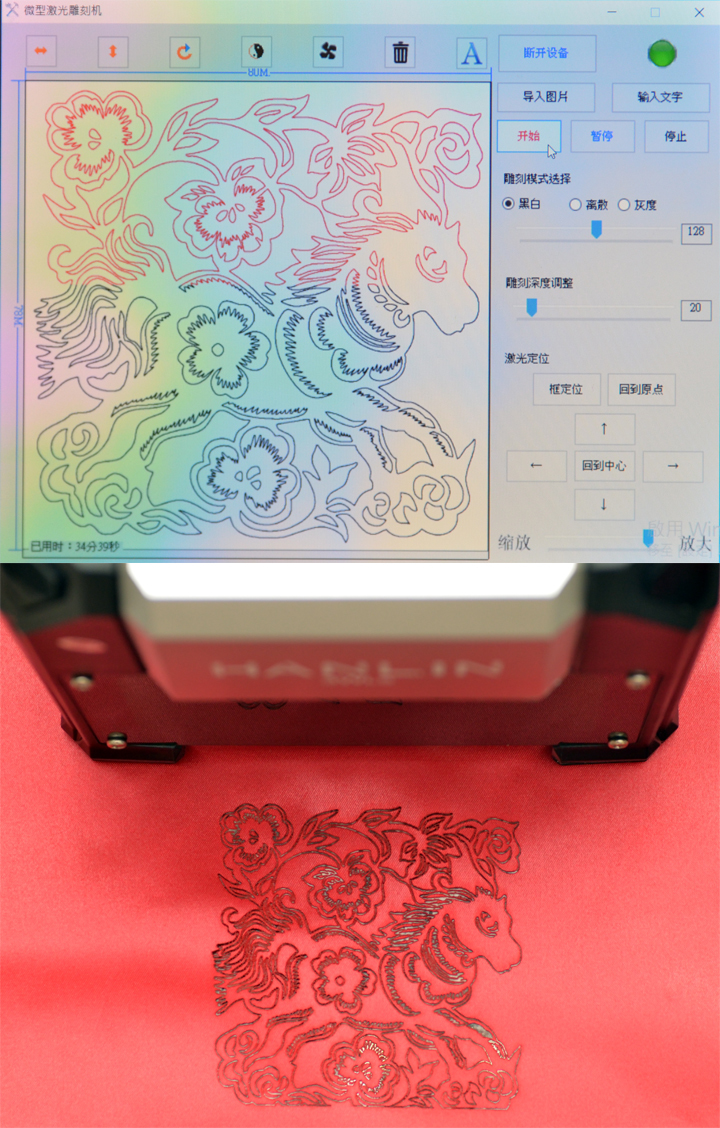 ▲ 擺放好要雕刻的物品,接下來點選連接雕刻機下方的『框定位』,先確認要刻的圖案面積是否落在預想位置,調整到最適合的位置後,就可開始來進行雕刻,可以看目前雕的位置與花費時間。