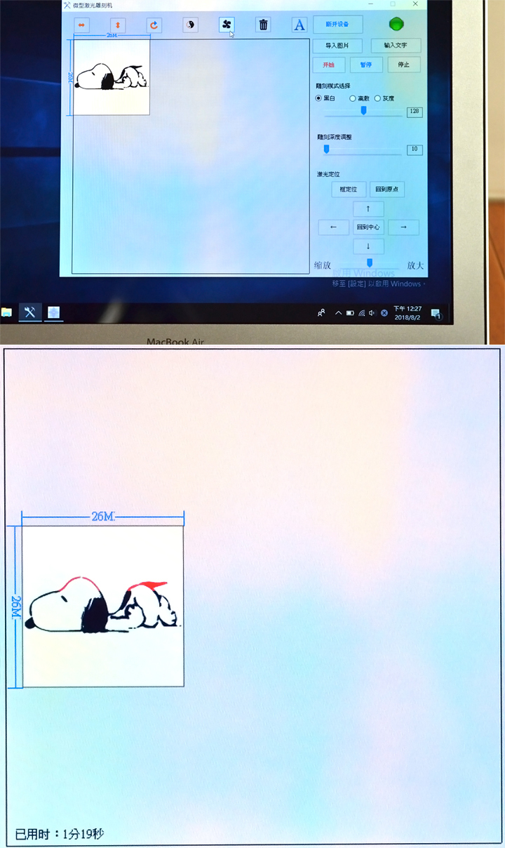 步驟就是打開軟體後>>拖曳照片>>調整大小>>預覽範圍>>開始列印,要打印前,需要先將雷射頭聚光焦點調整至1mm內,才會有良好的精細度,因為雷射光束越集中,它的亮度與功率才會更好。