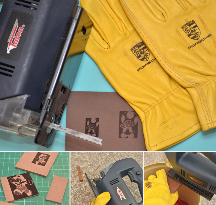 ▲ 準備開始來進行加工,拿出上次用LSD3雕刻的工作手套與線鋸機,牛皮手套多了跑車化圖騰後,質感可說提升了不少。