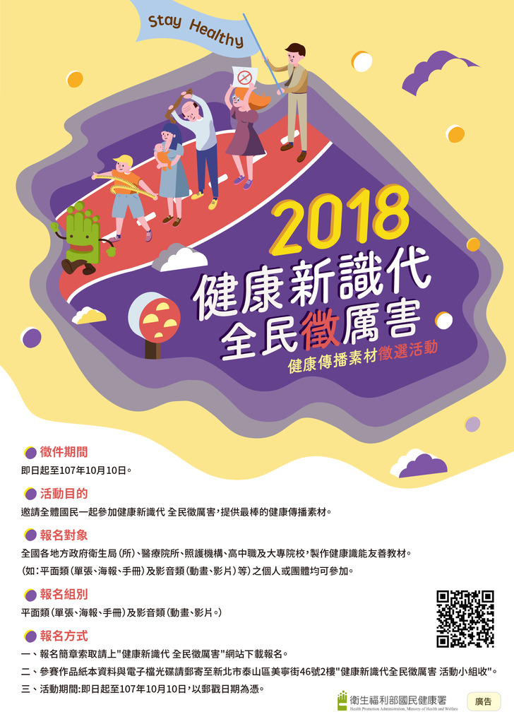 本次徵選之教材分成平面與影音2類,徵選主題包含檳榔防制、HPV疫苗、心血管防治、近視防治、母乳哺育、適齡婚育 、青少年性教育、孕期定期檢查 、維持健康體位、營養、空氣污染自我保護以及活躍老化等12項。本次活動總獎金高達138萬元,獎項共計90名!即日起至10/10,歡迎富有創意的你踴躍投稿,國健署邀請各界在推廣健康識能的路上,一起同行!