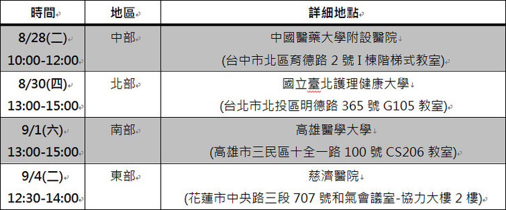 為讓參賽者對本活動有更多的認識,我們將舉辦4場徵件說明會,時間地點分別如下表所示: