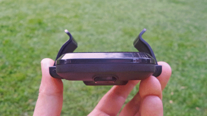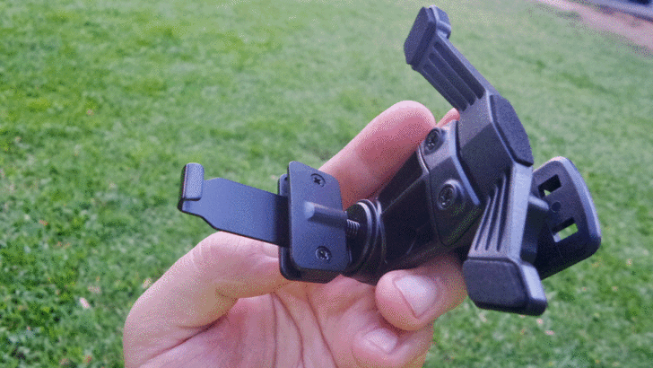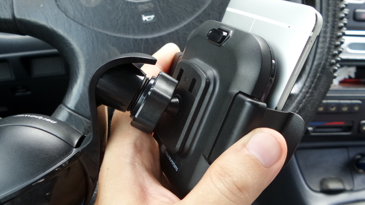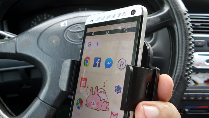 【▼】放上行動裝置後,利用左手拇指與中指將扣具內縮,由於扣具內緣有橡膠片,所以可以不用按壓釋放鈕而輕鬆快取。