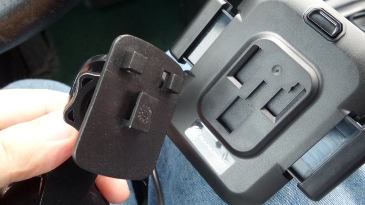 【▼】實際安裝儀表板的支架,首先先將支架T字連接頭(公插)與無線充電夾具(母座)後方孔位對準。