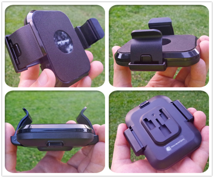 【▼】充電座兩側為夾具,背面為T字形的母座,雖然屬於免釋放快取夾臂的設計,有夾持手機快速便利的優勢,但還是有作釋放鈕,可能還是怕說有些裝置不好拿吧!