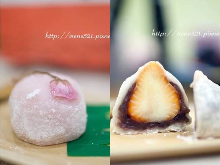 明月堂的招牌「草莓大福」,以手工的方式下去製作,和坊間的味道差別很大。Irene說:「櫻咲內包裹的是白豆沙,綿柔細緻的豆沙偏甜,櫻花漬鹹中帶櫻花的香氣,吃來鹹鹹甜甜的滋味很微妙。以及大福草莓薄嫩又軟又柔又滑順,裏頭包著滿滿的紅豆餡與一顆大草莓,皮薄餡多!有顆粒的紅豆餡,甜而不膩,草莓多汁香甜,搭配的恰恰好」