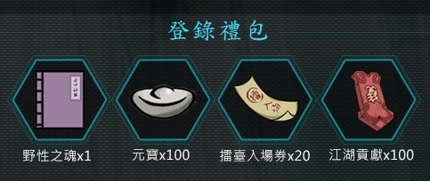 1. 事前用FB或email+手機號碼預約,屆時開服會送登錄禮包,內含野性之魂*1、元寶100、擂臺入場券20和江湖貢獻100