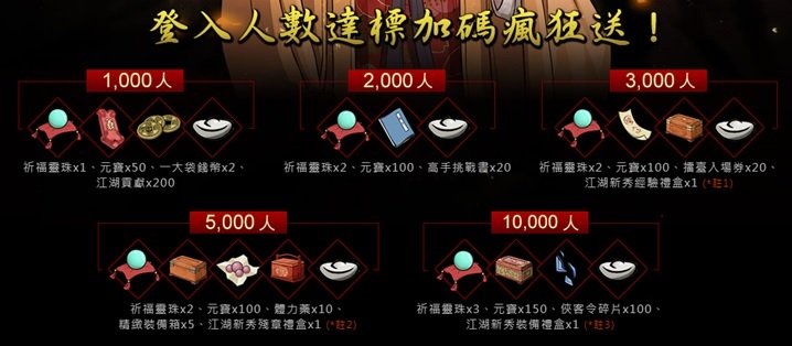 2. 若登入人數達標有額外好禮,1000人加送祈福靈珠x1、元寶x50、一大袋錢幣x2、江湖貢獻x200