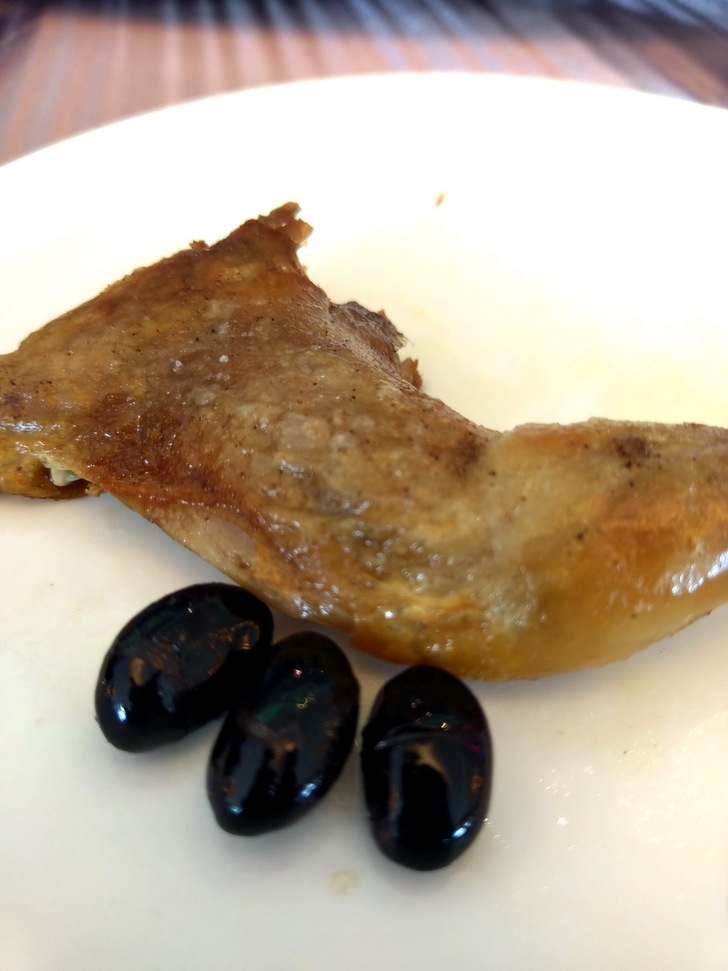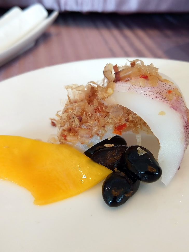 這是燙過的冰卷,上面淋上泰式醬汁與一點柴魚片,再搭配醃過的青木瓜與黑豆,非常清爽好吃,我相信這一定是我媽點的,因為她出生於靠海的鄉下,從小養成愛吃海產的習慣,平常在家我們也會川燙小卷或者透抽來吃,不過平常都是沾哇沙米醬油,搭配泰式酸甜醬汁還是第一次吃到。搭配青木瓜與黑豆更是一口接一口。