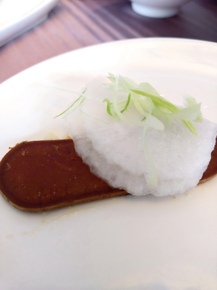 這是油魚子不是烏魚子喔,雖然兩者看起來很像,但是油魚子的油脂比烏魚子多,風味更加豐腴。無論是油魚子或者是烏魚子,料理方法其實很簡單,但實際料理得好卻很難,主要就在於火候,老媽在家烤烏魚子都會烤過頭,要吃烤得火候適中的油魚子或烏魚子還是要靠餐廳的大師傅才行。吃烤油魚子/烏魚子一般都要搭配白蘿蔔或者蒜苗,這樣吃起來鹹味中帶有甜味,還可以去腥。