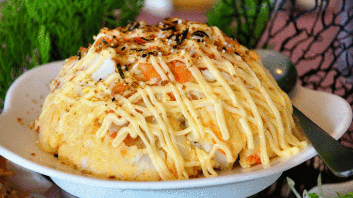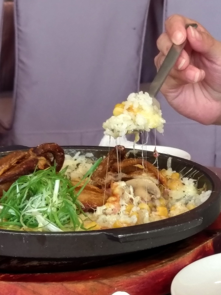 這道菜我聯想到一家日本餐廳-胡椒廚房,鐵板上放上肉類,米飯,起司,玉米還有黑胡椒,這道菜根本一模一樣啊。一勺米飯舀起來,起司都牽絲了