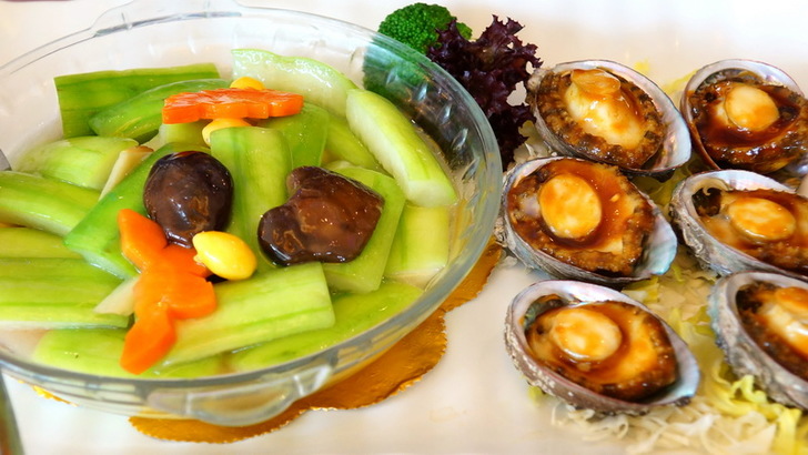 這麼幾道菜吃下來,我發現富基采儷婚宴會館的菜色口味大多比較清淡,算是符合現代人養生的觀念,這道塔香九孔鮑銀杏絲瓜也不例外,絲瓜,香菇,銀杏,紅蘿片與薑片只有很簡單的調味,完全都在吃絲瓜本身的甜味,不過紅蘿蔔片居然還有雕刻,這根本是海底雞的招牌嘛。