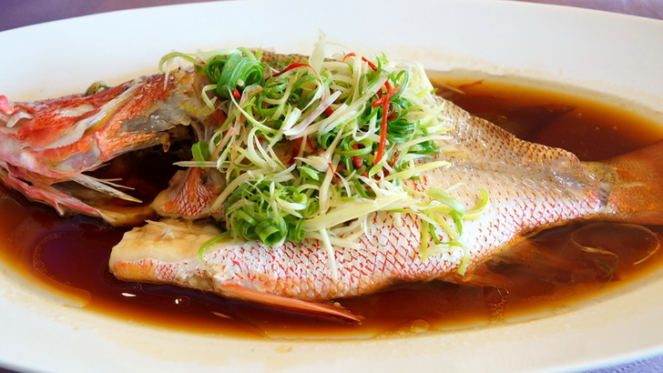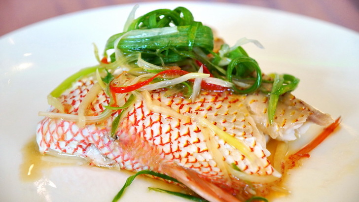 整條魚蒸熟之後,切一些蔥絲辣椒絲放在魚身上,廚房上菜之前燒少許熱油淋在蔥絲上,此時整條魚就會蔥香四溢了。