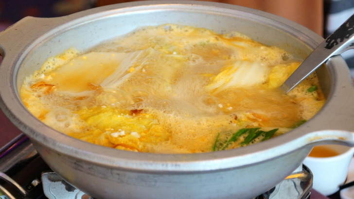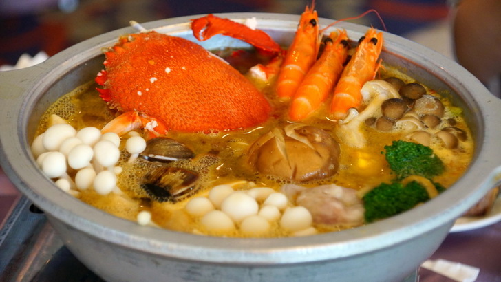 老實說,吃到這裡我已經很飽了,沒想到有個壓軸的狠角色上桌啦。這道火鍋是沙皇海鮮涮涮鍋(NT800)。火鍋剛端上桌的時候,只見湯頭是很少見的金黃色,鍋裡只有一些白菜,還搞不懂店家葫蘆裡賣什麼藥。沙皇?是俄羅斯口味的火鍋嗎?