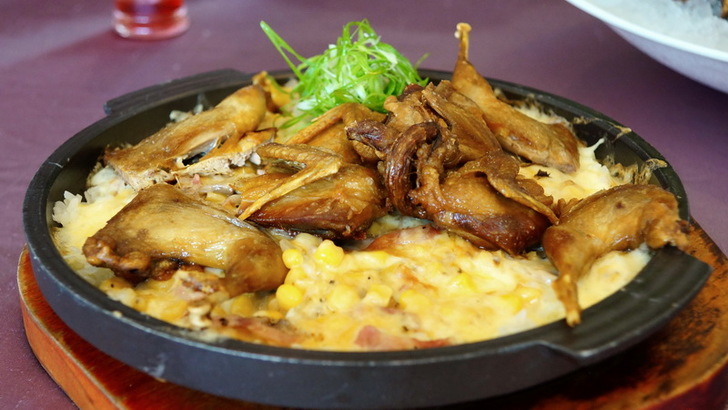 接下來第三道菜端上來的時候,我想說炸雞翅怎麼放在飯上,後來服務員才跟我說,這不是炸雞翅,是斑鳩……,這道菜的正確名稱是鍋巴玉米起司班鳩(NT400)。