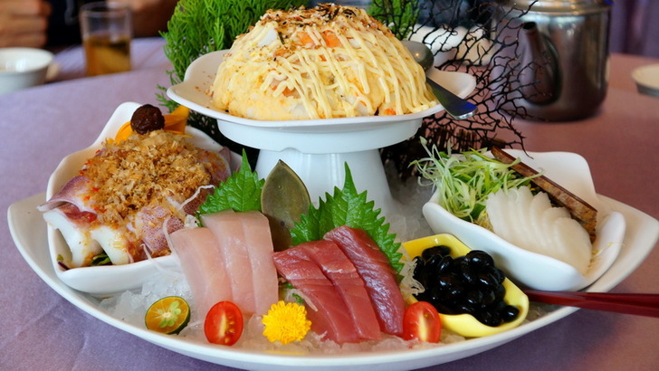 第一道是明蝦沙律泰式冰卷刺身拼盤(NT1200),裡面有好多種的好料拼在一起