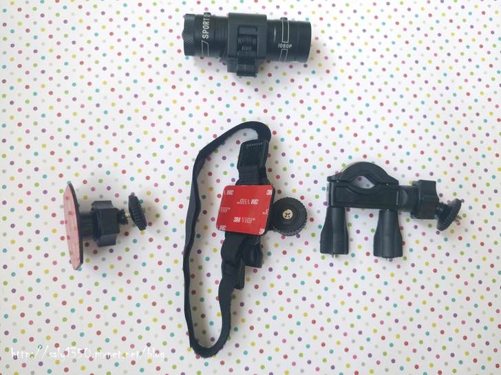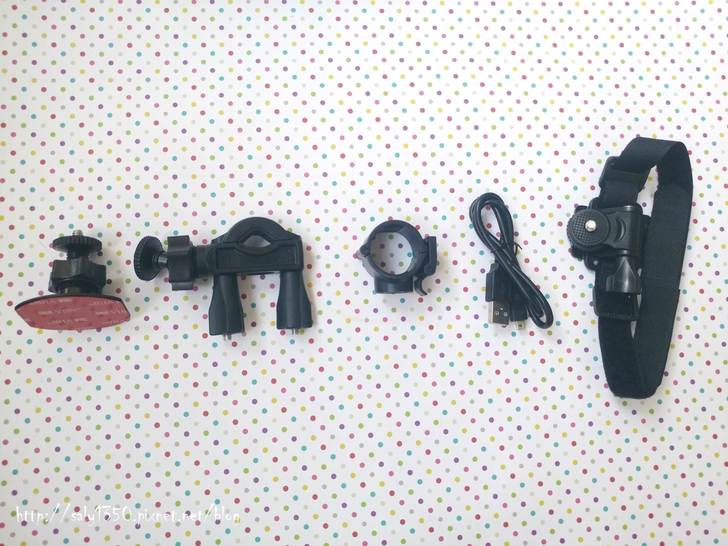 由左至右分別是汽車支架、腳踏車支架、行車記錄器套筒、USB線、運動綁帶