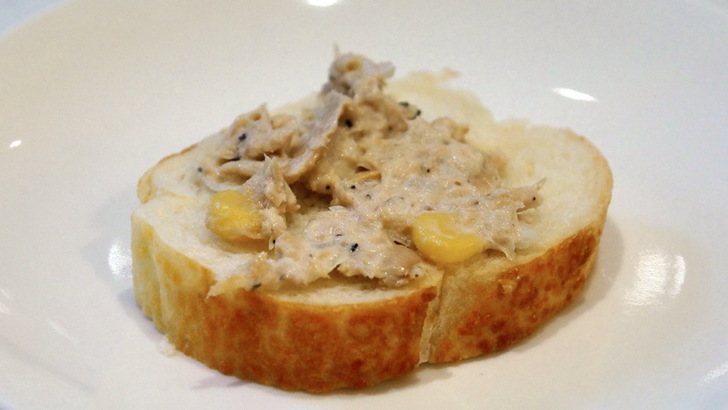 首先上桌的,這算是招待吧,一人一小片麵包,上面是鮪魚沙拉,免得讓你餓壞了。