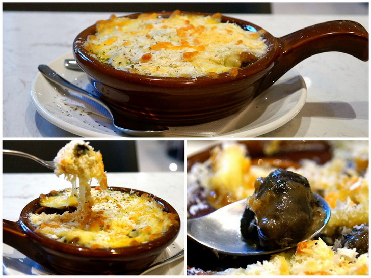 第二道開胃菜,老媽點的勃根地紅酒焗田螺剛端上桌時還熱騰騰的冒煙,紅酒應該是用來醃田螺去腥,田螺吃起來並沒有酒味,頗為鮮嫩,至於上面的起司烤得金黃又不過火,拉絲起來好看,吃起來也沒有惱人的乳臭味,如果能再給我們一片麵包沾著起司吃,應該會更棒。