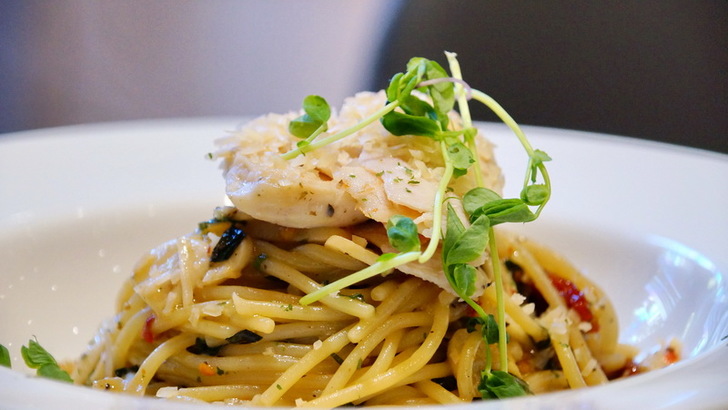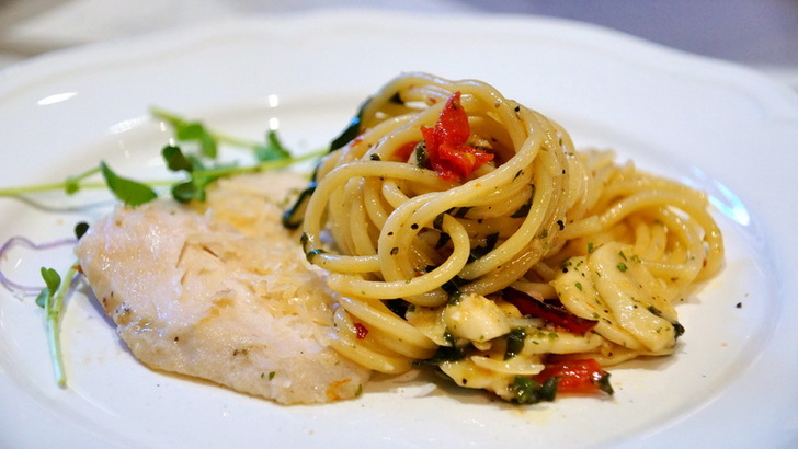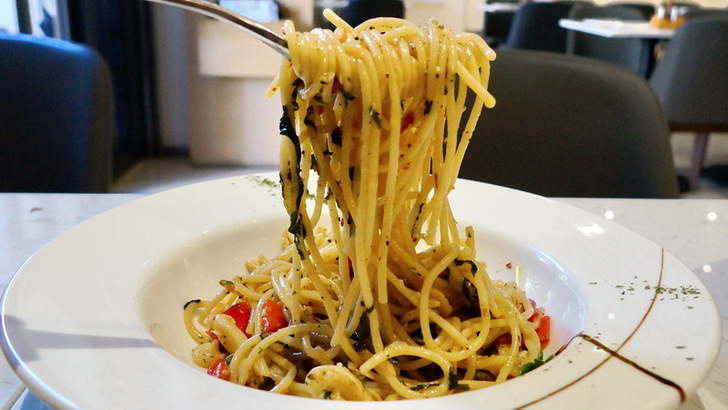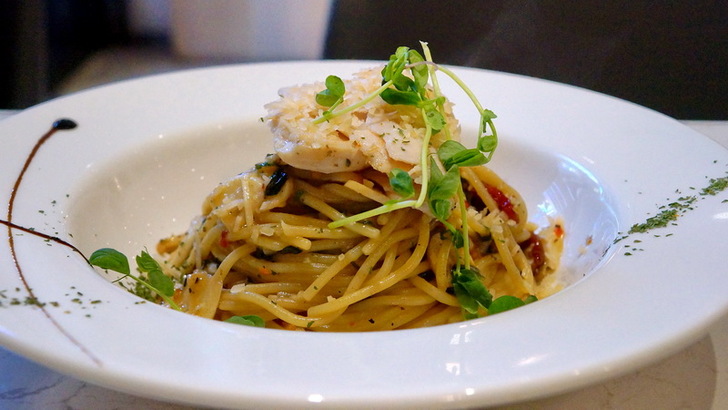 只是加了大蒜與乾辣椒清炒,這麵會好吃嗎?答案是真好吃,首先師傅的炒功了得,大蒜與乾辣椒用橄欖油炒軟,把大蒜與乾辣椒的香氣完全釋放出來,但是並不會辣,此外還加了義大利香料去拌炒義大利麵,這裡的義大利香料,不是一般我們在說的人工香料,所謂的義大利香料通常包含了百里香,迷迭香,巴西里,蝦夷蔥,羅勒,芝麻菜…..,當然啦,廚師都有自己的秘方香料,也不會公開自己的配方,所以我們只要懂得吃就好了,雞胸肉有四片,吃起來沒有腥味,也異常的軟嫩,我想可能用是舒肥的方式低溫料理加上香料去腥,雞胸肉才能如此好吃。