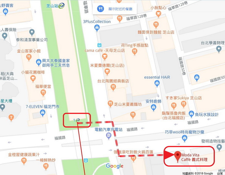 Moda Vita Caffè義式餐廳從芝山站的一號出口出來,向左前方越過馬路之後,只要110公尺就到了,位在一棟全新大樓的一樓,交通非常方便。