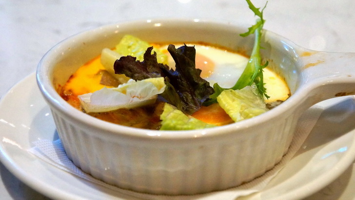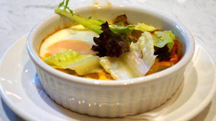 燉菜的表面有一顆大約7-8分熟的半熟蛋與起司,還有一些蔬菜作為裝飾,我之前沒吃過燉菜,但我知道葉菜類的蔬菜是無法燉煮的,能燉煮的應該是根莖瓜果類的蔬菜。