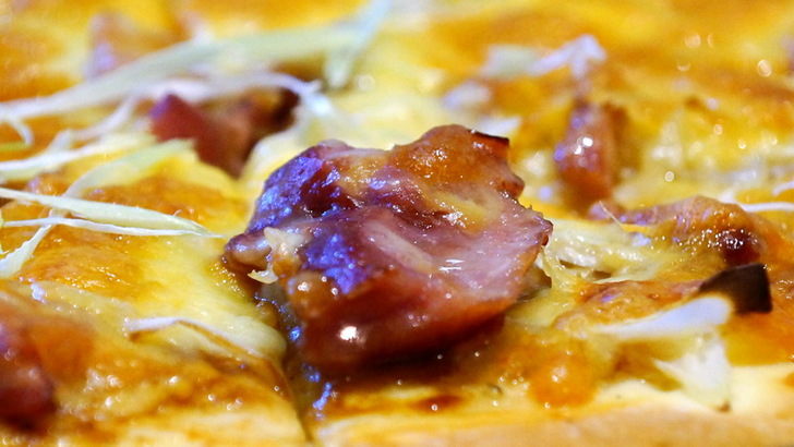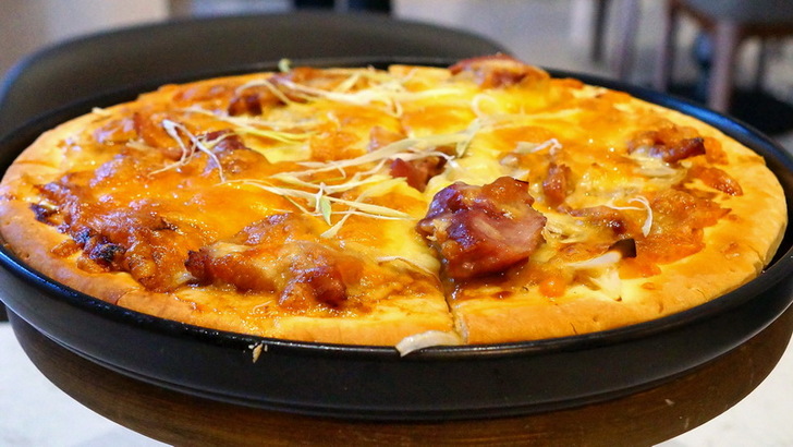 這披薩不但大,用料也非常大氣,鴨胸肉不但超大塊而且肥美多汁,烤過之後完全不乾柴,此外這披薩調味的醬料,應該是日式照燒醬的甜口味,搭配鴨胸肉很搭,上面灑上畫龍點睛的蔥白。