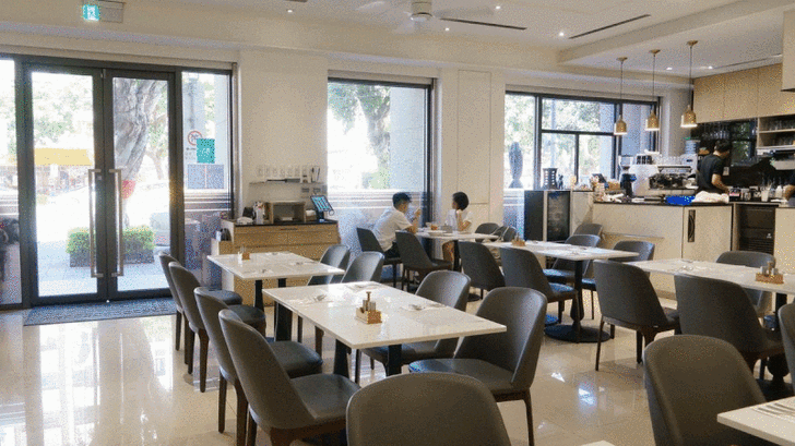 在餐點還沒上桌之前,我拍了一下餐廳的環境,基本上來說,Moda Vita Caffè義式餐廳的採光非常明亮,大量採用落地玻璃,陽光可以灑落到屋子裡,搭配淺色系的室內裝潢,時尚感十足。牆壁上的水晶燈與大片玻璃更顯氣質。