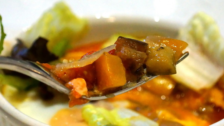 一杓舀起燉菜,果然沒錯,裡面有滿滿的蕃茄,洋蔥與南瓜,而且南瓜的種類似乎不只一種,蕃茄應該是經過長時間燉煮,化成了蕃茄糊,成了自然濃稠的湯頭,比起老媽點的勃根地紅酒焗田螺,吃起來相對清爽,充滿瓜果自然甜味。