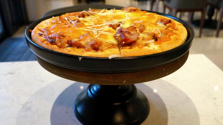 至於我點的甜醬蒜香鴨胸肉披薩,那更是驚人啦,你說浮誇我也不反對啦。幹嘛把披薩放在高腳托盤上,端出來的時候整個氣場碾壓其他餐點啊。