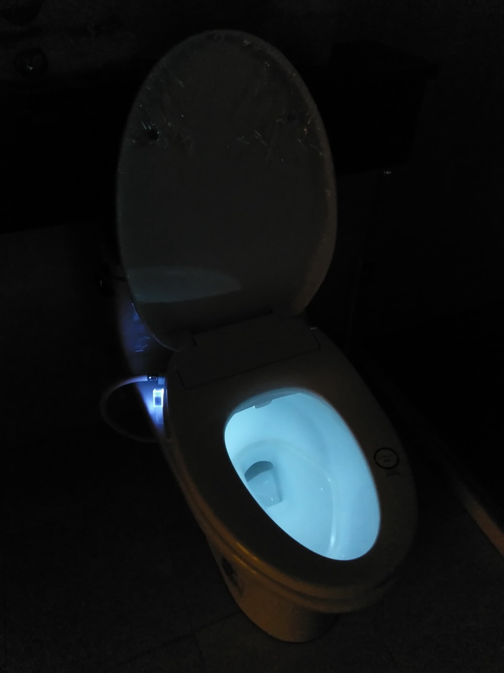 到了晚上,我才發現一個厲害的地方,KARAT凱樂衛浴KW-206超薄型瞬熱式電腦馬桶座有個很貼心的設計,白天只發現旋鈕有夜光設計,到了晚上才發現馬桶座內側也有夜燈設計,以後晚上老人家上廁所的安全性提高了不少啊。