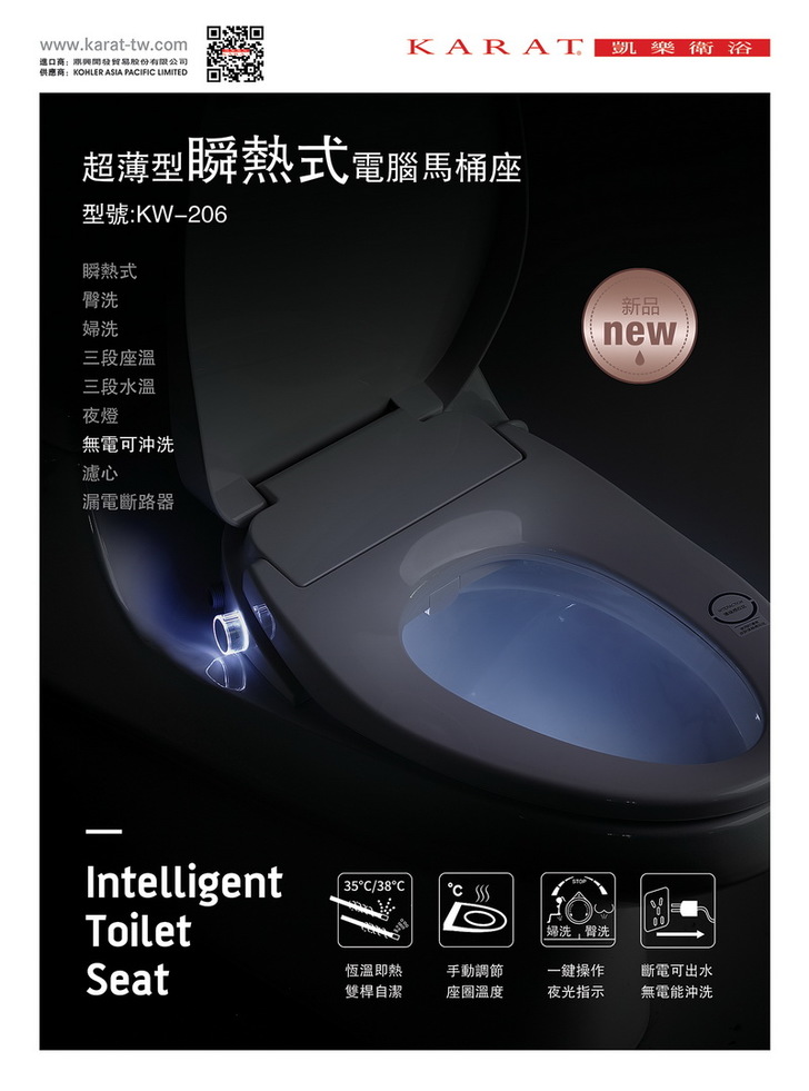 選了半天,最後我決定安裝KARAT凱樂衛浴的KW-206超薄型瞬熱式電腦馬桶座。KARAT凱樂衛浴是為美國KOHLER集團生產、製造、銷售之主力品牌之一,而美國KOHLER集團從1873年在美國威斯康辛州成立至今已有145年的歷史,是美國最大的衛浴設備的製造公司,也是全球最爲消費者熟悉高端的衛浴生產集團。美國KOHLER集團目前在世界各地擁有四十五家工廠,主要生産臉盆、馬桶、龍頭、浴缸等衛浴産品。
