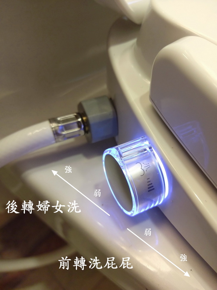 2. 面對電腦馬桶座的左側邊,是一個無段式的夜光旋鈕,如果你坐在馬桶上將旋鈕往前推,噴桿自體清潔 5秒後,臀部清洗噴桿伸出噴水清洗你的屁屁,之前說過這是無段式的旋鈕,水量大小會隨著旋鈕的轉動而變化。如果你把旋鈕往後推,這時候是婦女清洗專用,簡單來說就是男女身體構造的不同,所以需要不同角度的清洗方式。