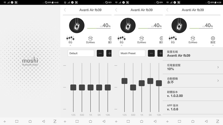 Moshi Bluetooth Audio能夠調整五段EQ,有Default、Moshi Preset 和 Bass Boost 三種預設EQ可選,此外,APP還有低電量提醒與自動關機的功能。APP能顯示耳機的當前電量,以10%為一個單位在跑,所以消費者會看到電量是每10%往下降。DJ4two據說能讓兩支藍牙耳機播放相同的音樂,適合和朋友一起分享音樂的情境,但我孤單一人去參加,所以,沒有測試。