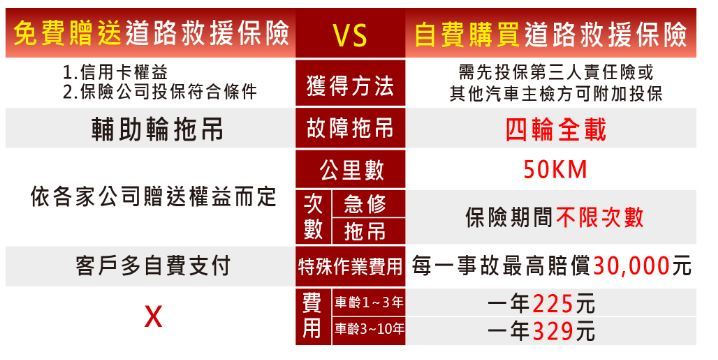 產險業者表示, 除只投保強制車險,就沒有這項加值服務 ,但有些保險如車體損失險是有附含免費道路救援服務,如電瓶沒電接電讓車子啟動、油箱沒水送水、汽車沒油送油(需自負油費)、車子爆胎更換備胎、車門故障或掉鑰匙需要車門開鎖等服務,及一般道路、省道、國道、山區及偏遠郊區的限里程基本拖吊 ,若只投保強制車險就沒有這項加值服務,但免費拖吊基本里程大多數為20~30公里以內,如果拖吊 距離超過20~30公里,每公里通常會加收50元, 免費拖吊基本里程要看消費者投保的保險公司和產險種類而定,根據國泰和新光產險公司倘若狀況是如下,費用則另計。